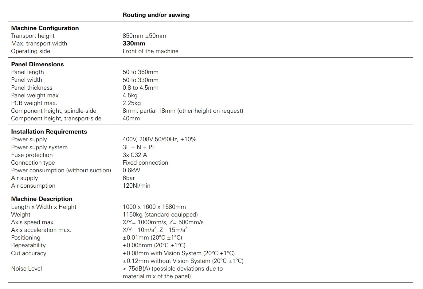 The machine has an X/Y/Z-axis system above the transport level and can be equipped with a saw or router. PCB positioning is done with an integrated stopper unit mounted at the